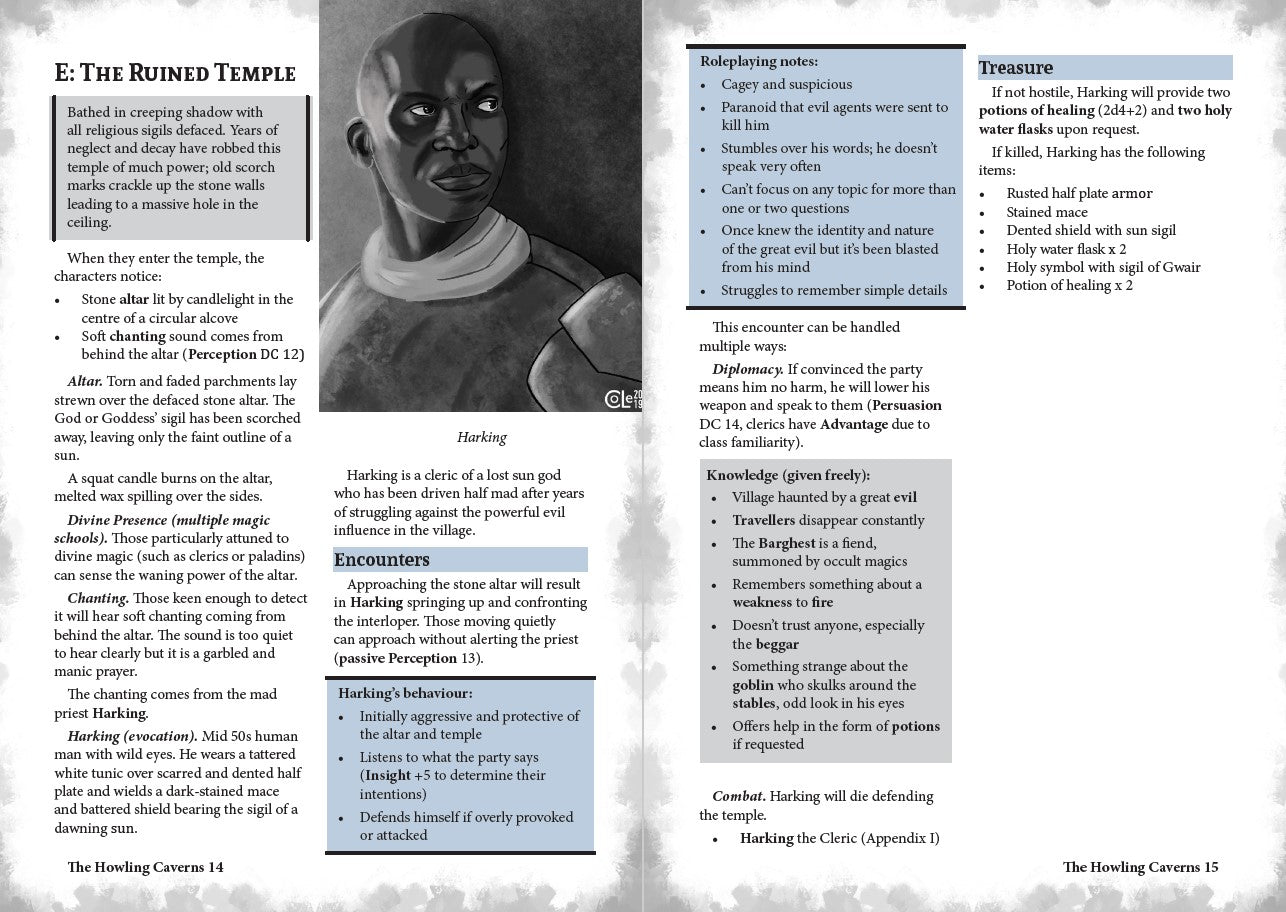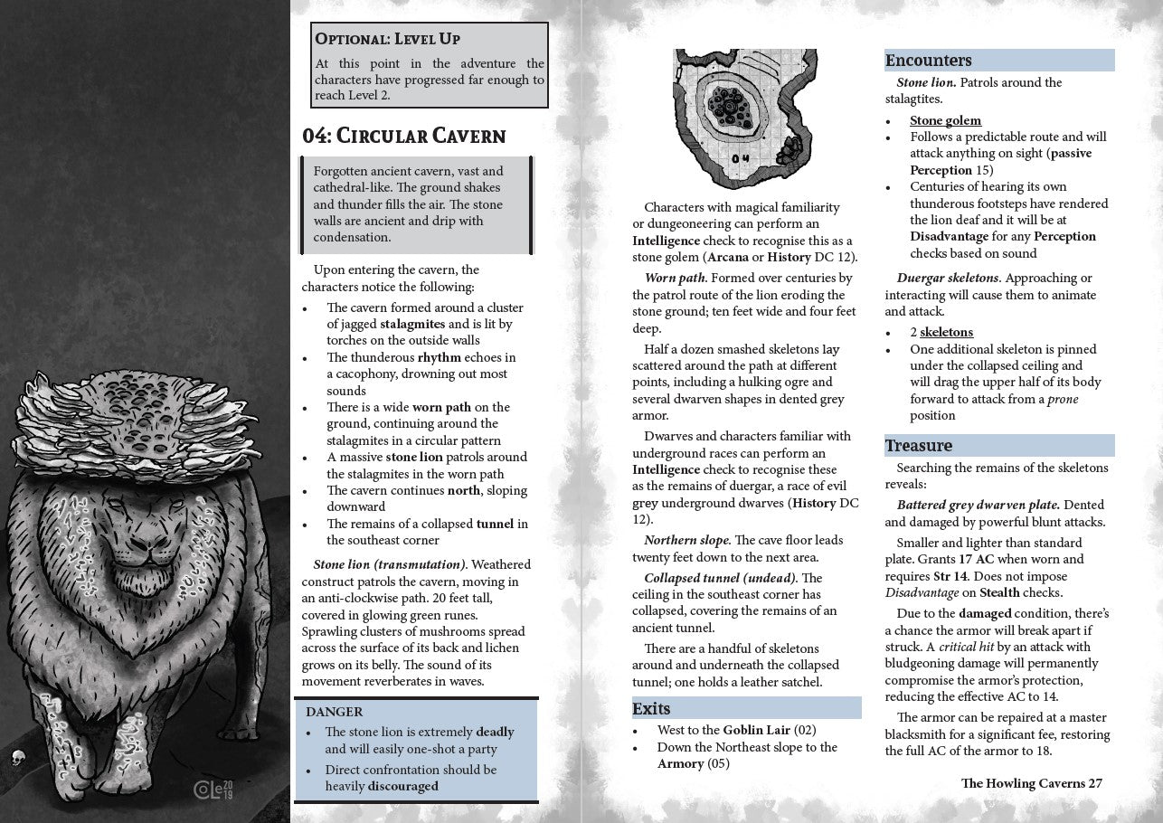 The Howling Caverns is a 56-page, black and white adventure for D&D 5th Edition, with a setting inspired by gothic horror and English folklore. The first book in the Eldritch Mists campaign set in the world of Boroz, an accursed and mist-shrouded land filled with dangerous creatures and eldritch influence.